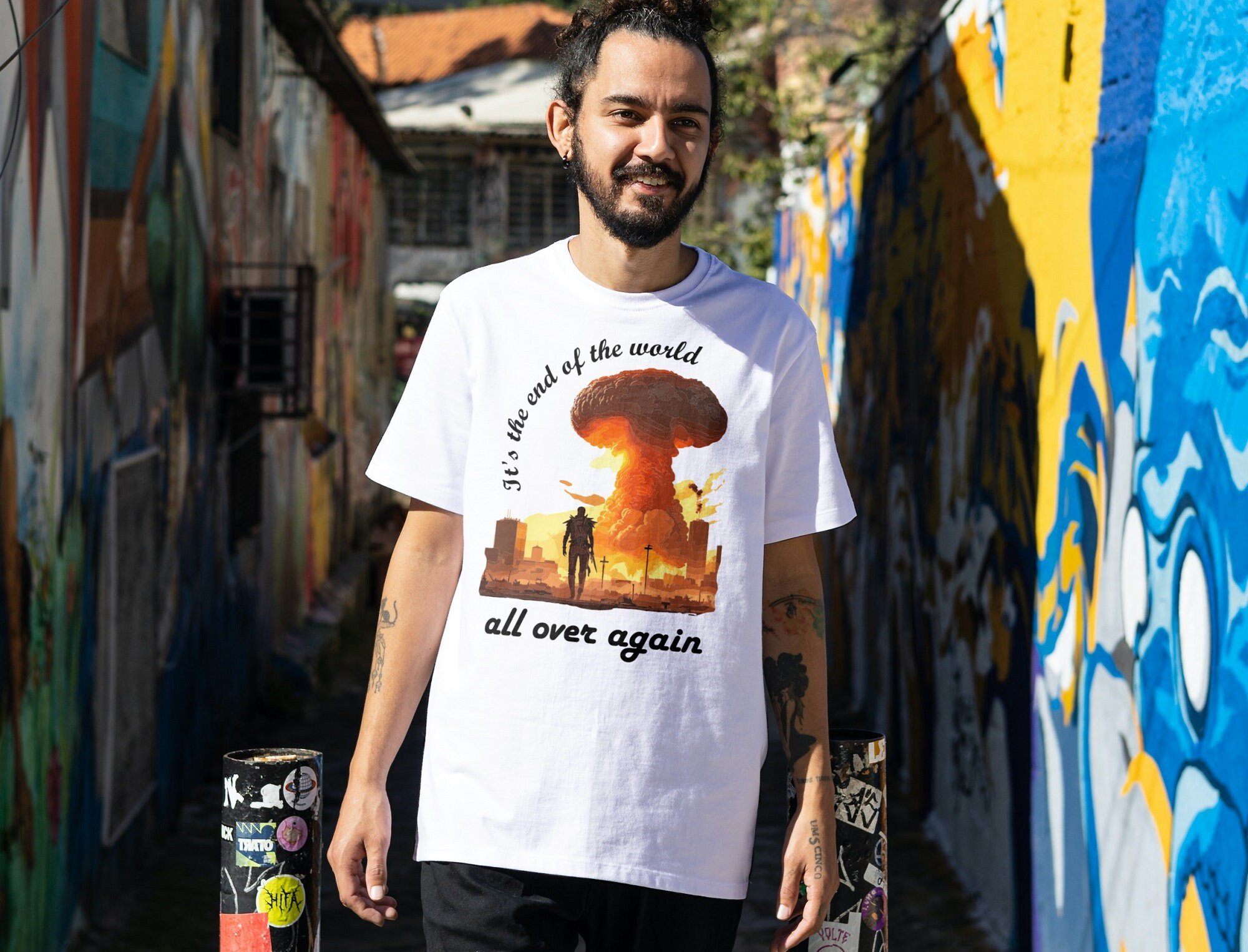 Experience the post-apocalyptic world with our Fallout Graphic Tee and Tote Bag Set. This set features an original design inspired by the iconic Fallout 4 ending, with the silhouette of the Sole Survivor against the backdrop of an atomic explosion at Boston C.I.T. The quote "It's the End of the World All Over Again" adds an extra dose of intensity to the design.