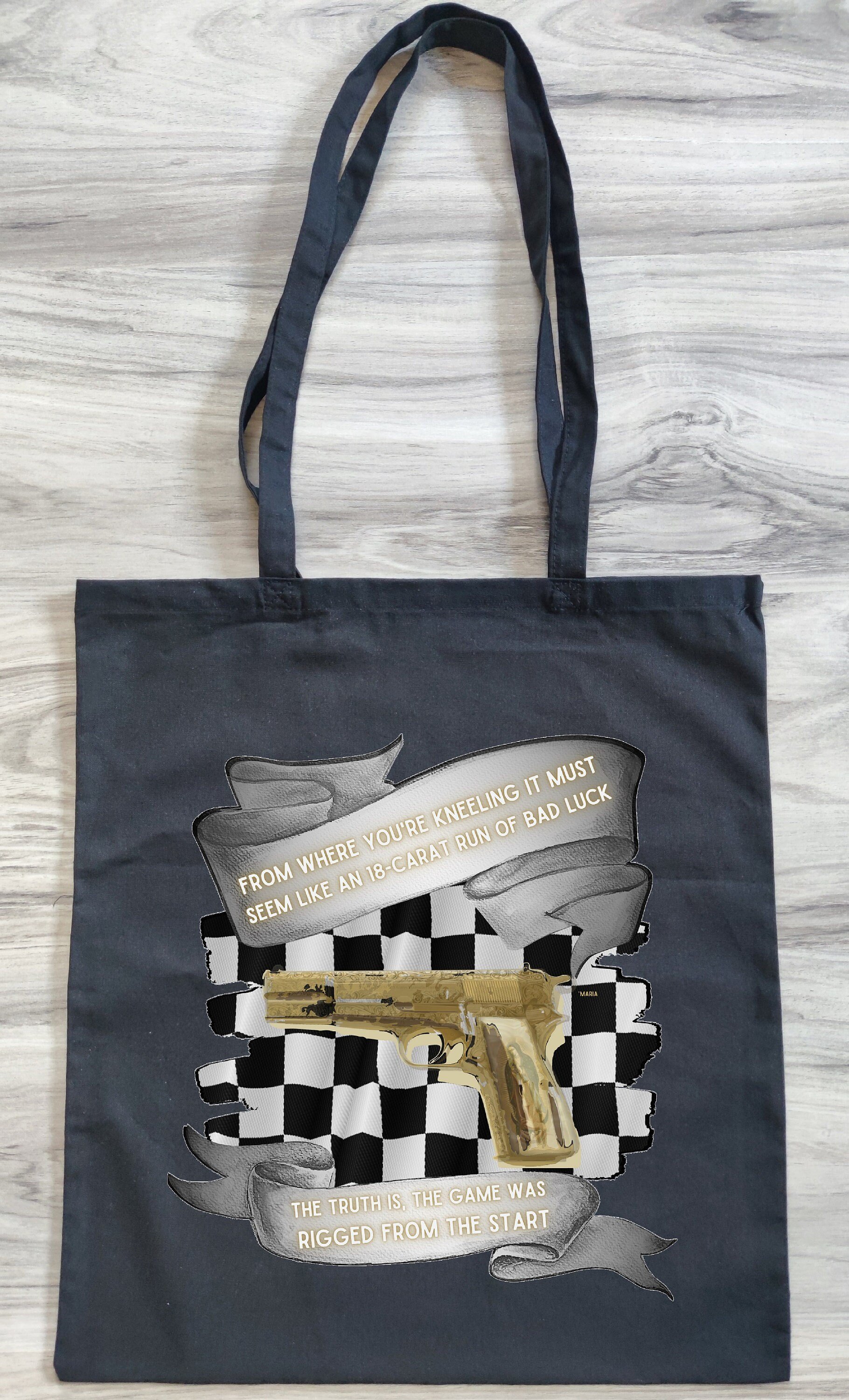 Embrace the legendary Fallout New Vegas "Maria" with this exclusive T-shirt and Tote Bag Set! Crafted from soft cotton fabric, the t-shirt features an illustration of the iconic unique weapon with a legendary game quote: "The truth is, the game was rigged from the start".