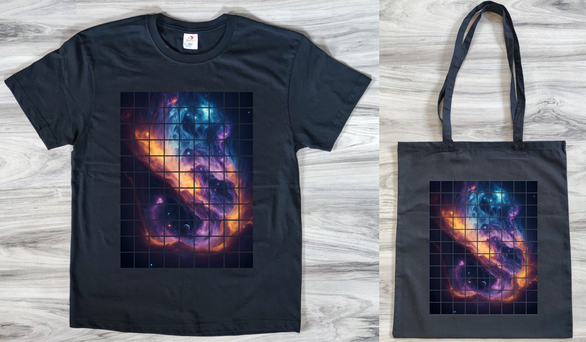 Galaxy Grid T-Shirt and Tote Bag Set - Cosmic Vibes, Unique Cut-Out Design