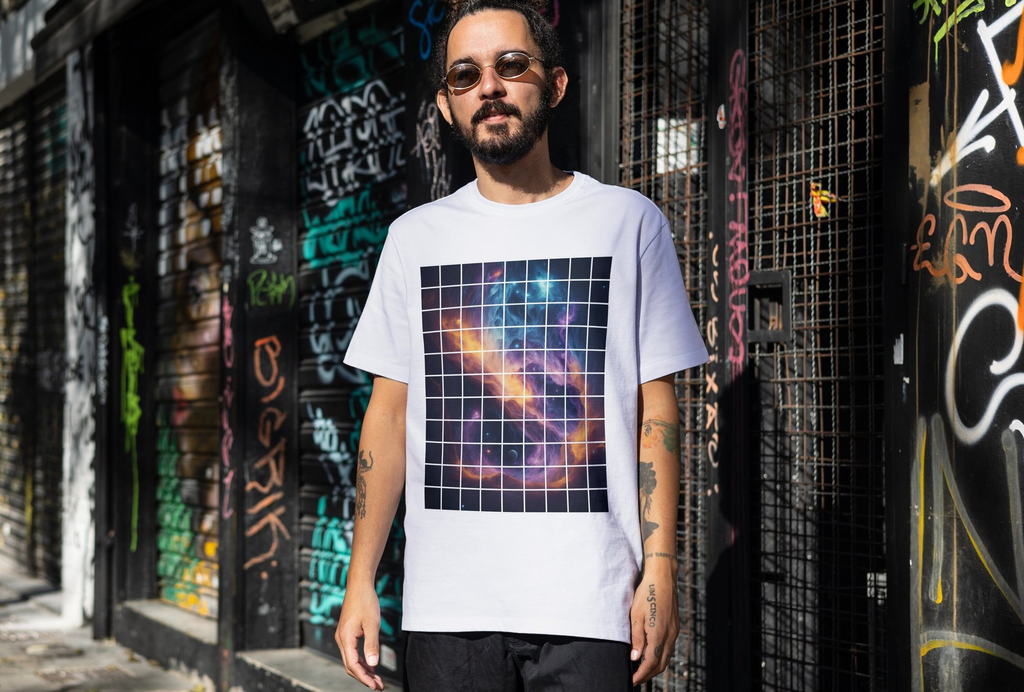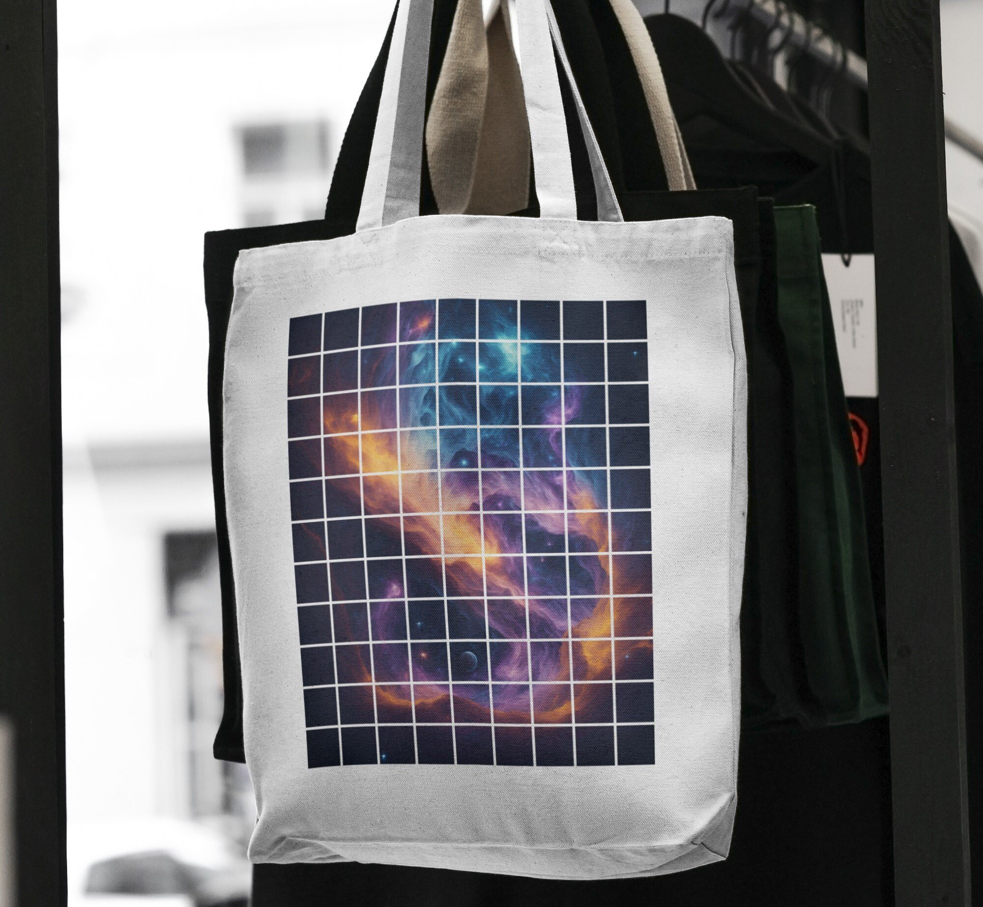 Embrace the cosmic vibes and showcase your love for the stars with this exclusive set. It also makes a fantastic gift for space enthusiasts and art lovers. Elevate your fashion game with the "Galaxy Grid" T-shirt and Tote Bag Set and let your style shine across the universe!