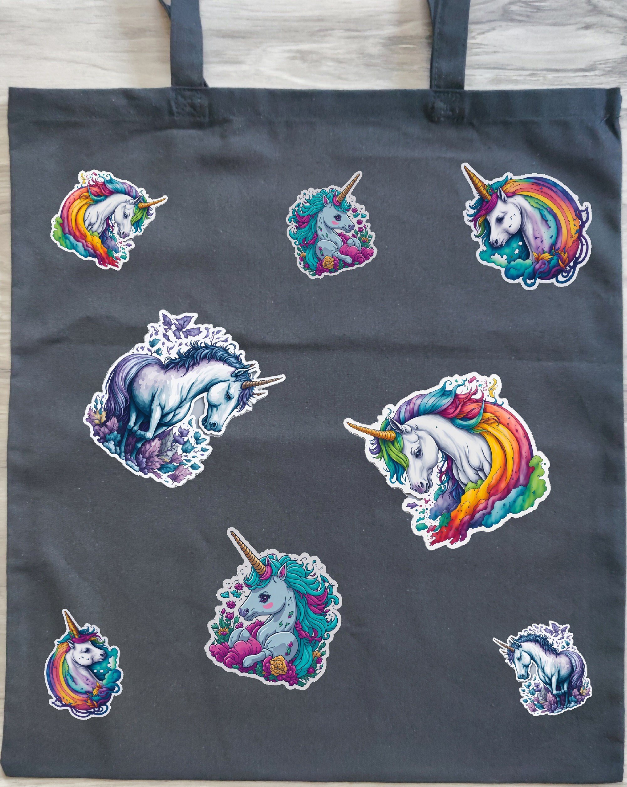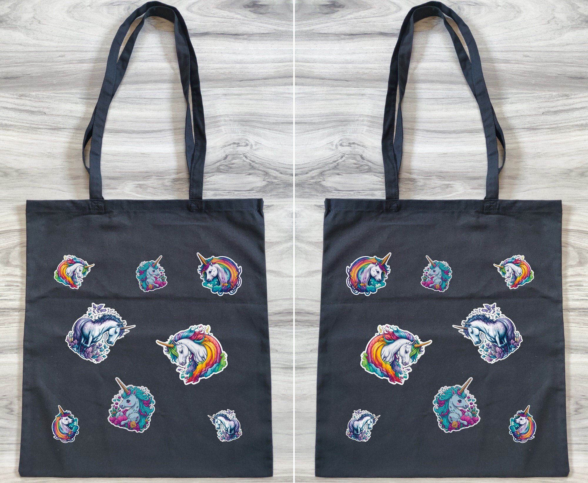 The unicorns are randomly sized and placed on both the front and back of the bag, creating a unique and playful pattern. Whether you're heading to the grocery store, the beach, or simply running errands, this tote bag is a versatile accessory that combines fashion and functionality.