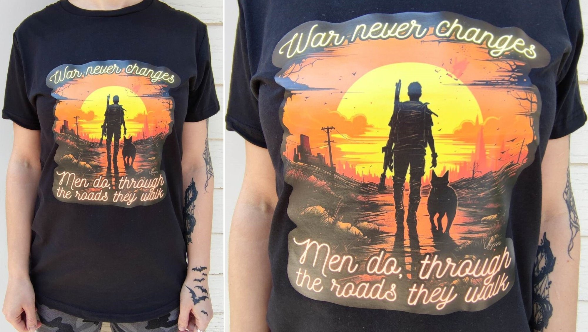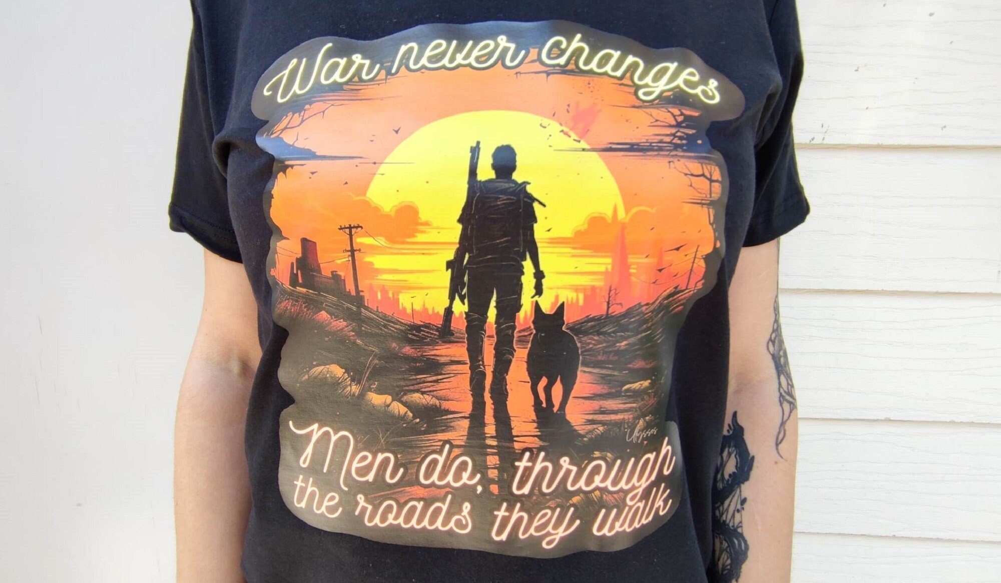 This unique t-shirt design features the iconic Lone Wanderer and his loyal canine companion, Dogmeat, walking through a post-apocalyptic wasteland as the sun sets on the horizon. The phrase "War Never Changes" sits above the image, a nod to the Fallout game franchise, while the quote "Men do, through the roads they walk" appears below, adding a thoughtful touch to the design.