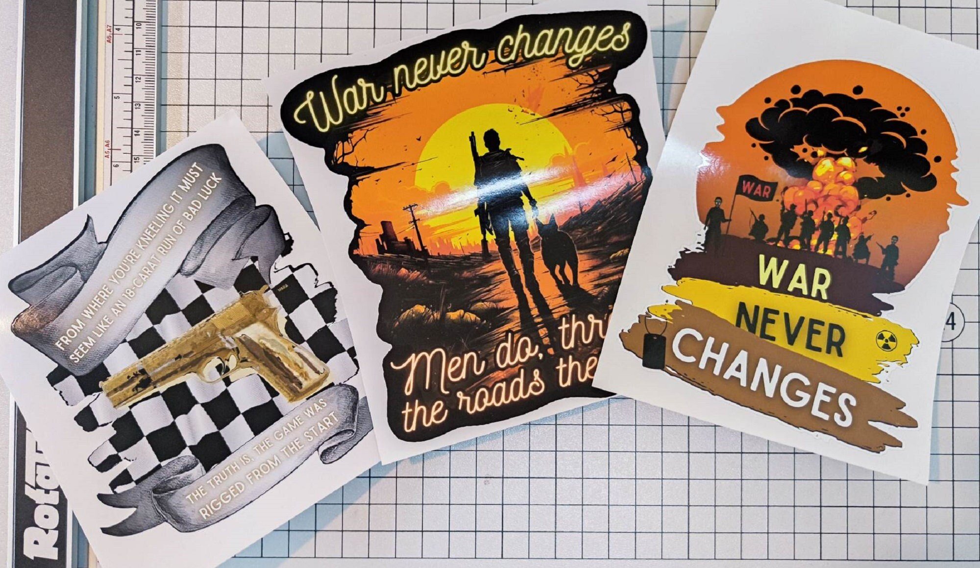 Add a touch of Fallout to your belongings with these unique Fallout-themed stickers. These high-quality vinyl stickers feature stunning designs and quotes from games such are "War Never Changes", "Men Do, through the roads they walk", and "The Truth is, the game was rigged from the Start".