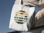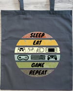 Level up your style with this epic "Sleep, Eat, Game, Repeat" tote bag. Perfect for gamers and gaming enthusiasts, this tote bag features a bold and eye-catching design that showcases your love for gaming. The design incorporates gaming icons and typography in a dynamic layout, creating a visually striking appeal. Made from durable and eco-friendly materials, this tote bag is both fashionable and sustainable. The spacious interior provides ample room for carrying your essentials, making it ideal for everyday use or as a gamer's go-to bag.