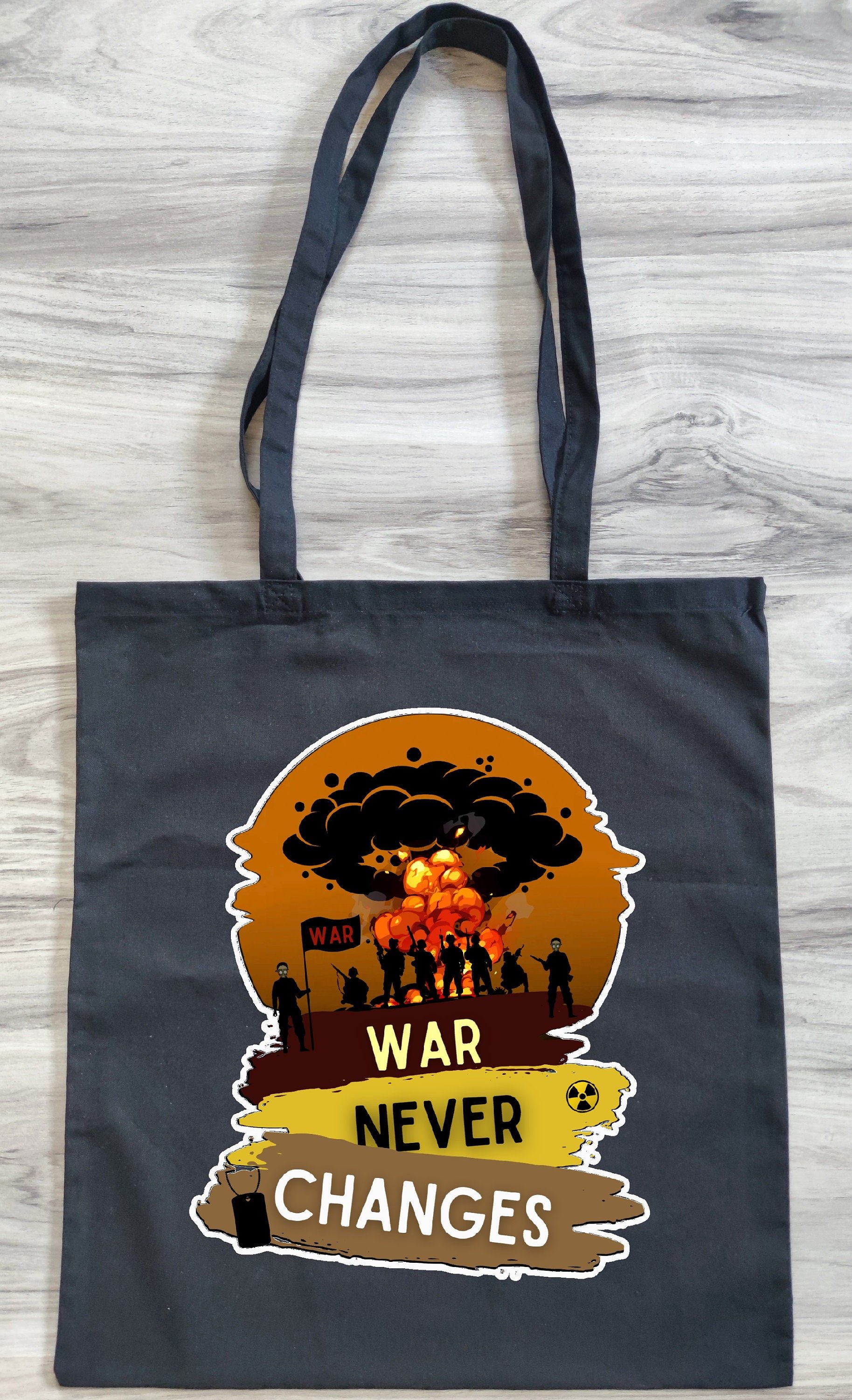 Whether you're a fan of the game or simply appreciate the vintage military aesthetic, this tote bag is a stylish and functional accessory. Carry your essentials with pride and let the world know that war never changes!